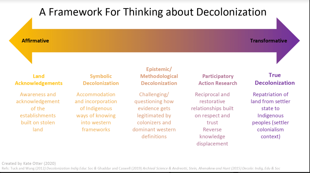 The SJS workshop included creating our own web of Research Justice using this pdf worksheet to interrogate our research practices, keeping in mind the framework for thinking about decolonization: